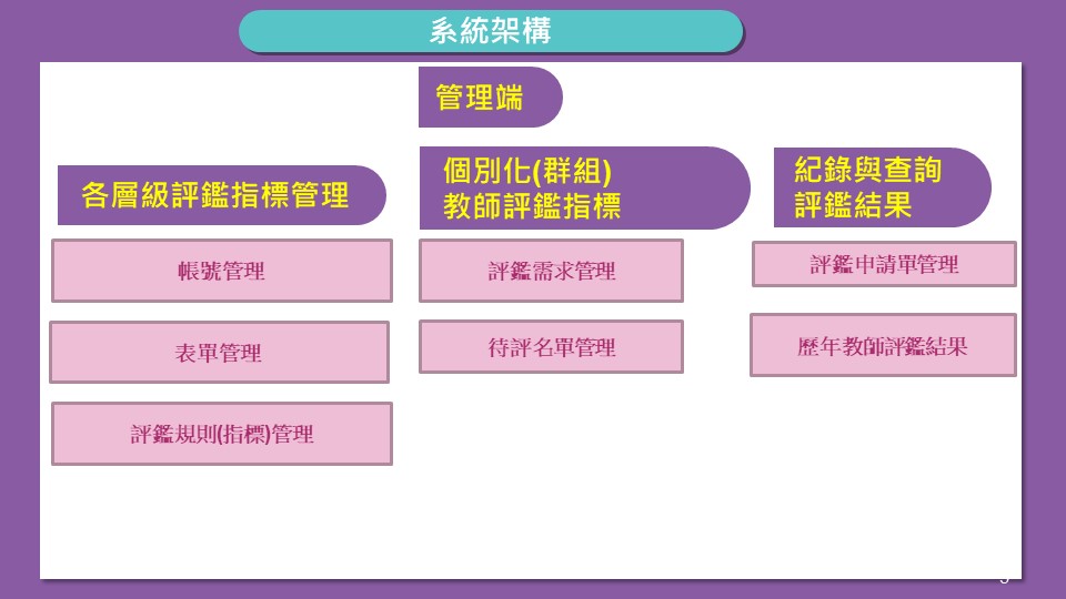 全方位教師評鑑系統,提供行政人員針對系級、院級、或校級評鑑指標管理與對應,亦可設定專人負責不同的權限;因應學校不同年度修正的教師評鑑指標,亦可隨時新增;並確保每一年版本的指標對應不同的教師群來進行評鑑權重設定,俾利管理各項指標之維護。